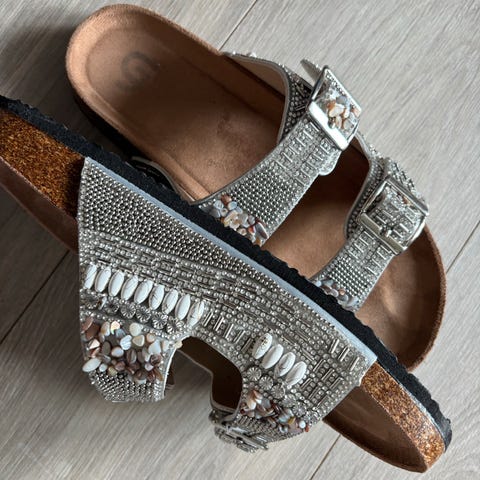 Pene sandaler med lav hel i nydelig blått stoff. Brukt en gang. De er str 40, normal i størrelsen. Pose til oppbevaring følger med.