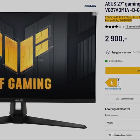 ASUS TUF ASUS 27" VG27AQM1A skjerm med fokus på gaming. Skjermen har en størrelse på 27 tommer og er designet for å gi en god visuell opplevelse ved spill og generell bruk.