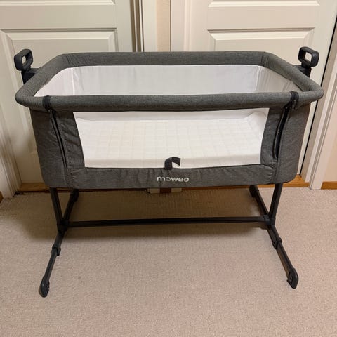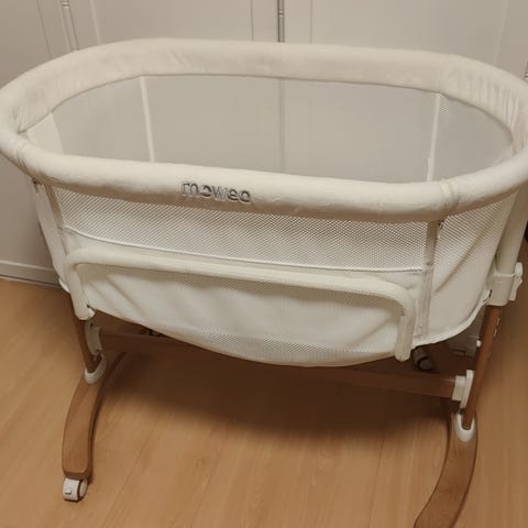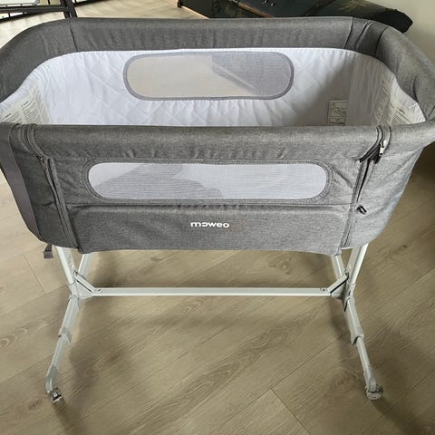 Moweo bedside crib i rosa farge. Designet for å plasseres ved siden av foreldreseng for enkel tilgang til barnet. Har justerbar høyde og hjul for enkel forflytning. Laget med myke materialer og nettingpaneler for god ventilasjon og oversikt over barnet.