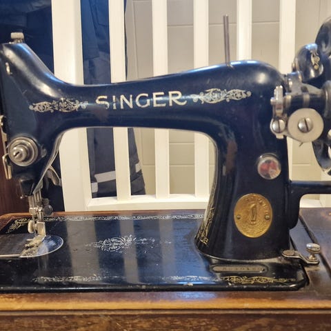 Maskin med masse tilbehør: pedal, strømkabel, syskrin med masse føtter og annet, original koffert, sybrett, pære, og original manual (slitt).