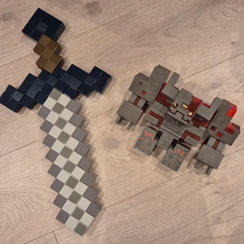 Minecraft Treverk leketøy sverd i flere nyanser av grønt og brunt.