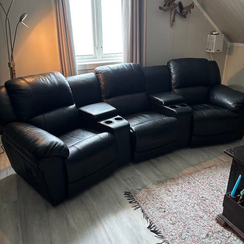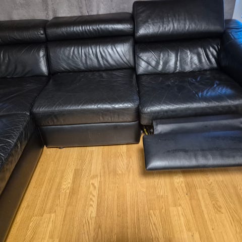 Svart skinnsofa med fotstøtte - 3 seter + 2 seter - Pent brukt