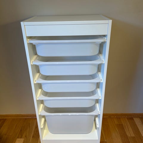 Ikea trofast veggoppbevaring med 6 hvite bokser selges. Veldig pent brukt.