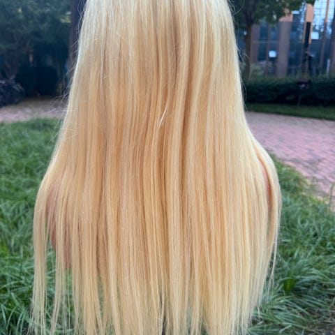 R'osolite lang syntetisk parykk i blond farge. Parykken har en naturlig bølget stil og er designet for å gi et realistisk utseende. Kjøpt hos spesialfrisør, kun brukt 1/2 dag. Stativ til å sette parykken på kan du få på kjøpet. Kan også sende med løsvipper og øyebrynstatoveringer.