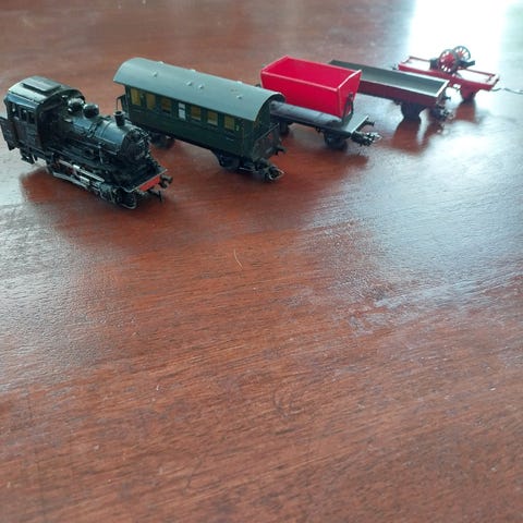 Marklin togset i orginaleske fra 60-tallet inkludert lokomotiv, flere vogner, skinner og noen ekstra skinner og vogner. Selges samlet kr 2 800,-. se bilde.