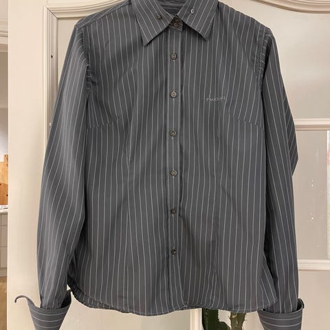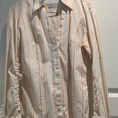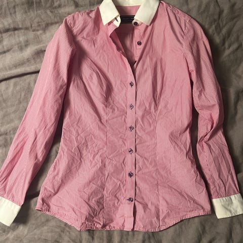 T MICHAEL. Skreddersydd dameskjorte. Hvit m/rosa stjerner over hele stoffet. Størrelse L. 110 cm over bysten. Doble mansjetter med knapphull for mansjettknapper. Klassisk snitt. Strøken, som ubrukt.