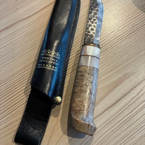 Flott kniv med skaft i tre. Slire i svart lær. Leveres i fin eske. Merke: Janne. Marttiini.