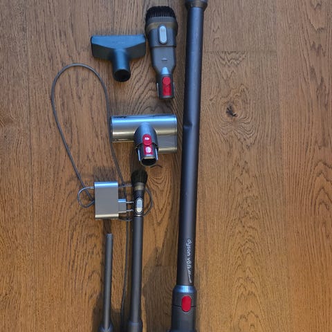 Dyson V11 støvsuger med flere tilbehør, inkludert ulike børster og munnstykker for forskjellige rengjøringsbehov. Enheten er trådløs og designet for effektiv rengjøring av ulike overflater.