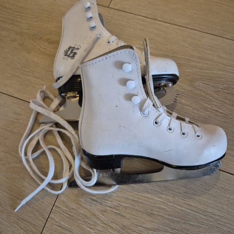 Playmaker Andre skøyter barn str 30 i hvit farge. Skøytene har dekorative detaljer på sidene og er utstyrt med tradisjonelle snøringer. Egnet for barn som bruker størrelse 30. Brukt kun noen få ganger.