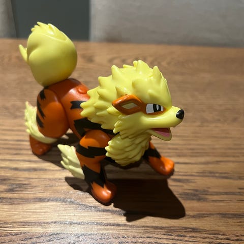 Pokémon Battle Feature Figure Arcanine figurine i original emballasje. Figuren har detaljer som etterligner Arcanine fra Pokémon-serien, inkludert farger og design.