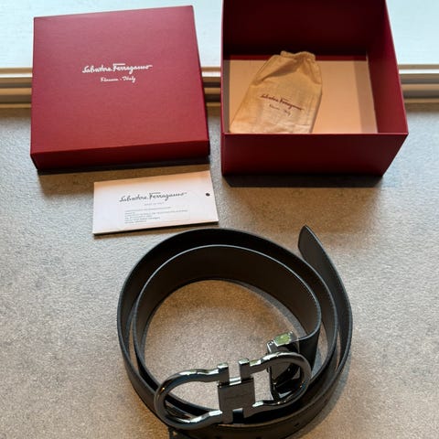 Salvatore Ferragamo belte for herre laget av svart skinn. Beltet har en metallspenne med karakteristisk Ferragamo-logo. Leveres med original eske og beskyttelsespose. Belte er av lengden 100cm