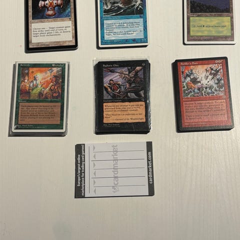 Vintage Magic the Gathering Samlekort / kort. Det er totalt 8 kort her. Det beste er Isochron Scepter fra Mirrodin. Det finnes også kort fra Legions, 7th Edition, 8th Edition, og Torment.