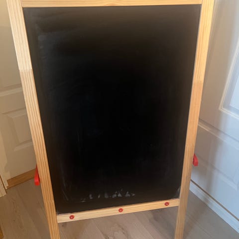 Barnestaffeli i tre med hvit finish, utstyrt med en grønn tavle og papirholder. Passer for barn til tegne- og skriveaktiviteter.