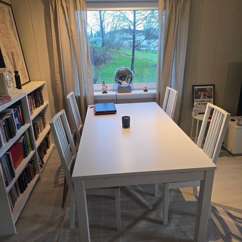 Greit stuebord med rik hvit farge og stoler.