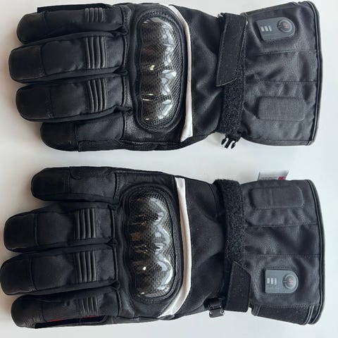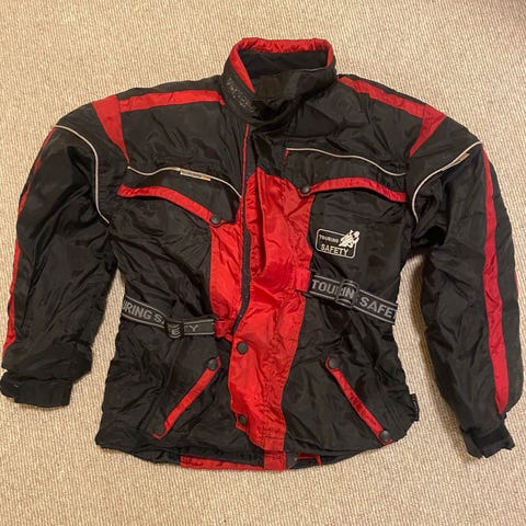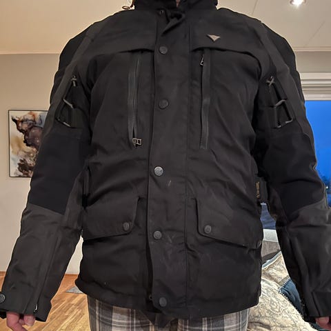 Dainese Gore-tex MC jakke i størrelse 56, og bukse i størrelse 52. Jakken har belte for justering, flere lommer med glidelås og beskyttelse på albuer og skuldre. Buksen har integrerte knebeskyttere og elastiske paneler for bedre bevegelighet. Utstyret er av eldre type men fungerer utmerket.