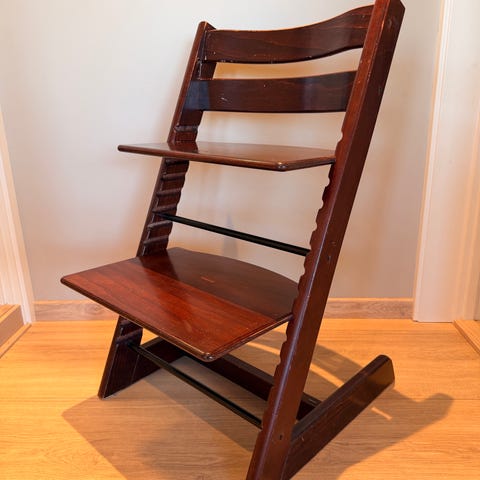 Stokke Tripp trapp stol laget i tre. Justerbar sitte- og fotplate for tilpasning til barnets vekst. Designet for barn og gir støtte i høyde for spisebord eller lignende bruk.