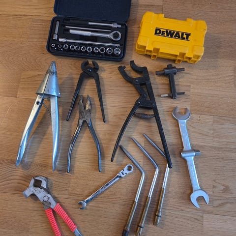 Bahco verktøysett bestående av fire håndverktøy i metall. Settet inkluderer ulike typer skiftenøkler og tang, egnet for mekanisk arbeid og reparasjoner. Verktøyene har robuste håndtak for godt grep. Og elpress. Som kosta 10 k elpress opp til 50mm, billig billig.