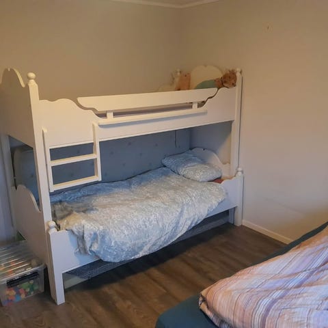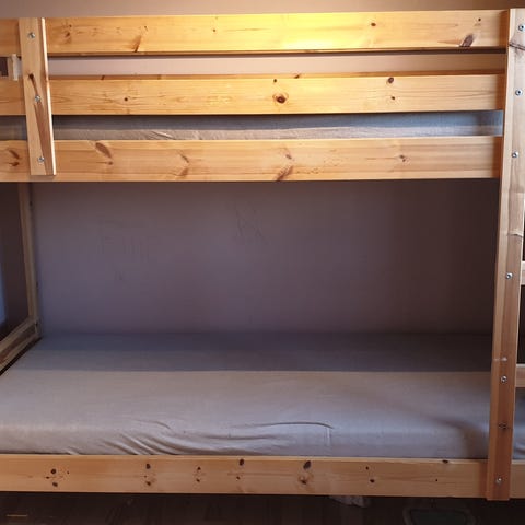 Senga er brukt og har noen merker her og der men er mye igjen av sengene. Føler med gode madrasser, eine er tjukk også er ei tynn til å beskytte.