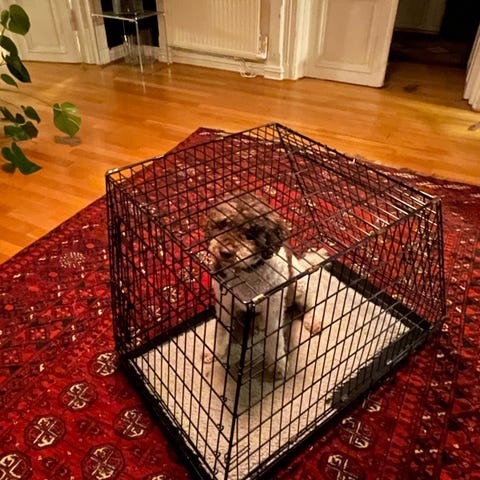 Pent og nesten ikke brukt hundebur fra Dogman. Lett, solid og sammenleggbar. Perfekt for reiser og tar liten plass å lagre. Str Large. 50x50x70cm