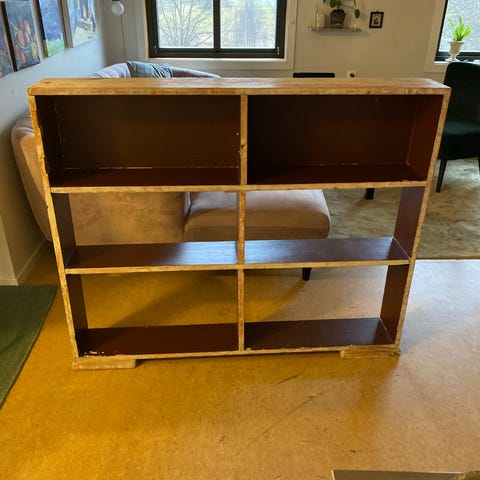 Treskap med ni rom og et midtmontert speil i døren (CD størrelse) . Skapet er laget i tre og har et firkantet design med en liten åpning i midten av døren som viser speilet. Egnet for oppbevaring og organisering av små gjenstander og/eller CD.