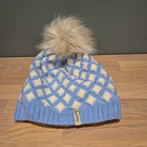 Fin lue fra Janus med dusk. Gul farge, ull. Fleece innvendig. Pent og lite brukt. Passet fra 3-6 år hos oss.