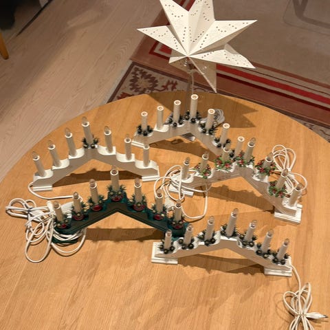 Et par små defekte pærer på adventstakene. Syns omtrent ikke fra avstand (se bildene).