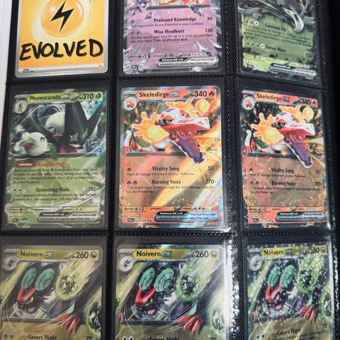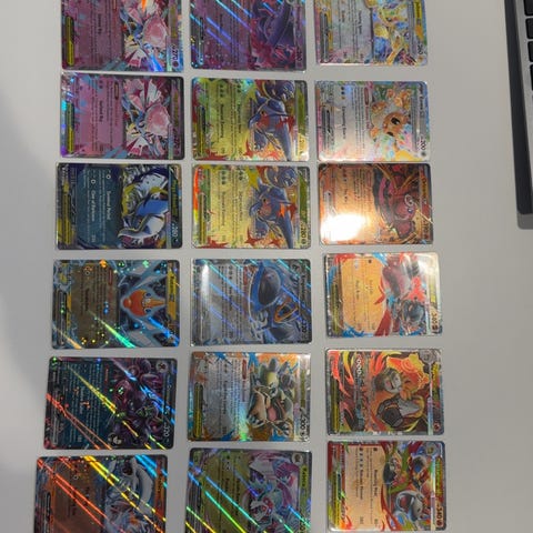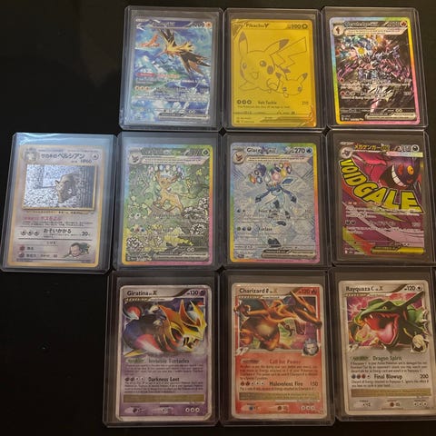 Pakke med 10 Pokémon samlekort med ulike karakterer og illustrasjoner. Kortene varierer i farger og design, og kan brukes til samling eller spill.