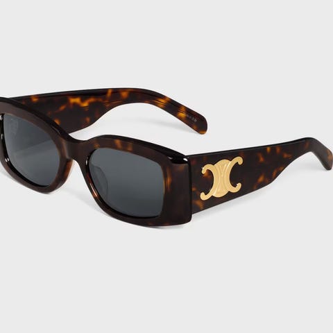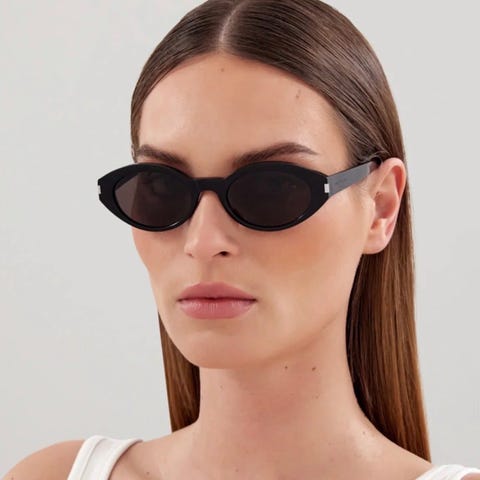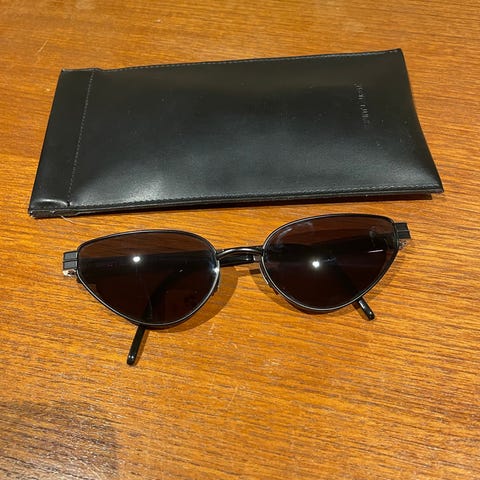 Saint Laurent SL M94 dame solbriller i brunt. Kjøpt på Synsam sommeren 2025. Brillene har et katteøye-design og logo i metall på sidene. Materialet er acetat, og de er tilpasset damebruk.