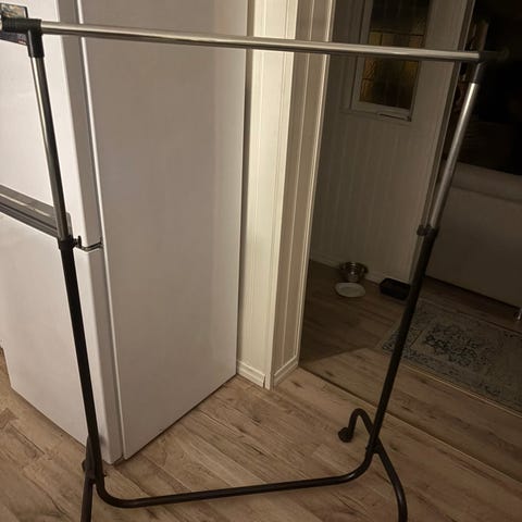 Sort metal stativ til jakker og sko med 8 hengere i metall. Passer fint i inngangspartiet