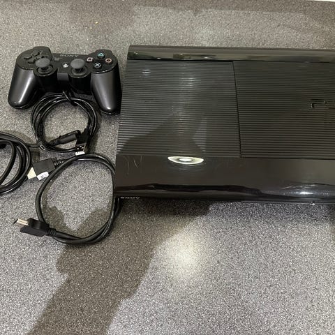 Sony Playstation 4 spillkonsoll med tilhørende kontroller.