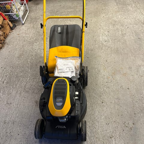 Selger STIGA bensindrevet gressklipper, selvgående og med oppsamler.
