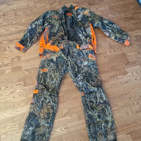 Härkila jaktbukse i camo-mønster, størrelse 52. Laget for jakt med slitesterkt materiale og kamuflasjefarge for bedre tilpasning i naturen.