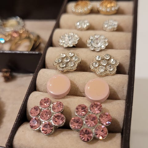 Halskjede og øredobber fra Haus of Dietrich, merke Marlay. Boksen er åpnet, men smykkene er aldri brukt eller tatt ut av boksen.