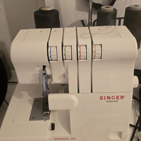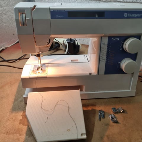 Maskinen syr ikke men motoren virker. Det ene tannhjulet for spesialsting er sprukket.