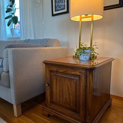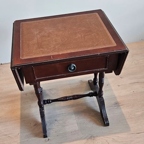 Klassisk sidebord i heltre med skuff selges. Små skader i lakken på toppen (se bilde 2)