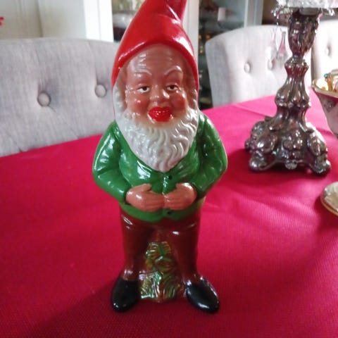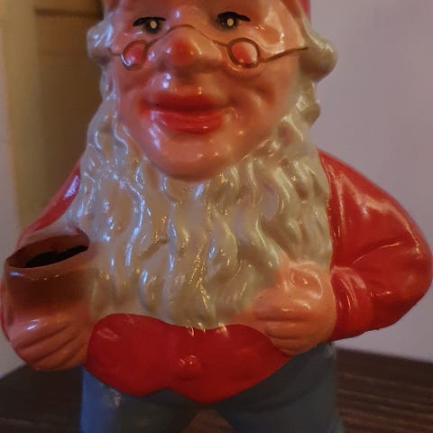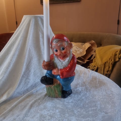 Tysk nisse med gris, til tynne små lys. Fra 1920-30 tallet. Ingen sprekker. Selges samlet