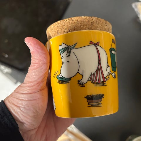 Arabia Moomin Friends forever kakeboks med lokk. Krukken har dekorative motiver fra Moomin-serien på lilla bakgrunn. Laget av keramikk, egnet for oppbevaring av mat eller andre små gjenstander. Fikk den i julegave, den er helt ny og ubrukt.