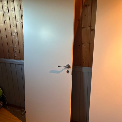 Hvit innerdør med stålvrider og låskasse. Døren har en glatt overflate og er tilpasset standard innerdørsmål. Passer til bruk i bolig eller kontormiljø.