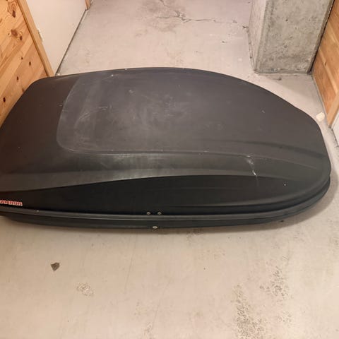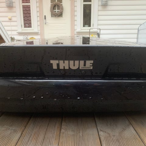 Thule Dynamic L takboks. Denne kommer med justerbare fester, slik at den passer de flere takstativ. Kan åpnes på begge sider.