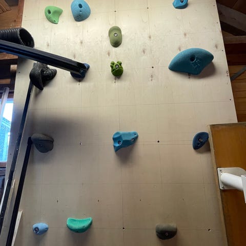 Sett med klatregrep i ulike farger som blå, grønn, gul, rød, hvit og svart. Grepene har varierende former og størrelser, med hull for montering. Egnet for bruk på klatrevegger for både barn og voksne. 30 stk de største er en annen type , glattere.