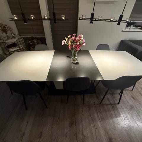 Helt og fint rundt spisebord med ileggsplate som er lett å ta av og på.