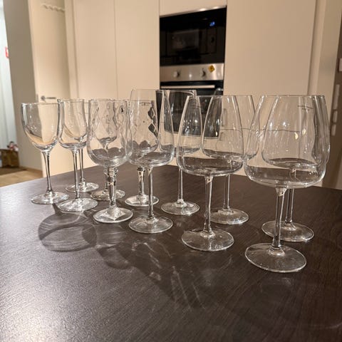 IKEA vinglass i klart glass. Passer til servering av vin og andre drikker. Enkel design uten dekorasjoner. Selger 12 stk vinglass til 100,- og 8 stk champagneglass i plast til 100,-