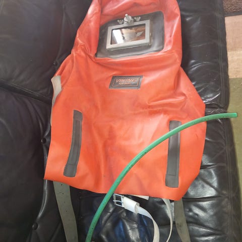 Den er tung .Patentprodukter A/S sandblåser med metallkonstruksjon. Utstyrt med runde vinduer og låsbar dør. Designet for industrielle rengjørings- og overflatebehandlingsoppgaver.