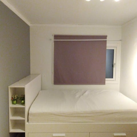 Senga er stor, men vi har da ikke trengt å ha kommode eller bokhylle på rommet, siden denne har dekket behovet.