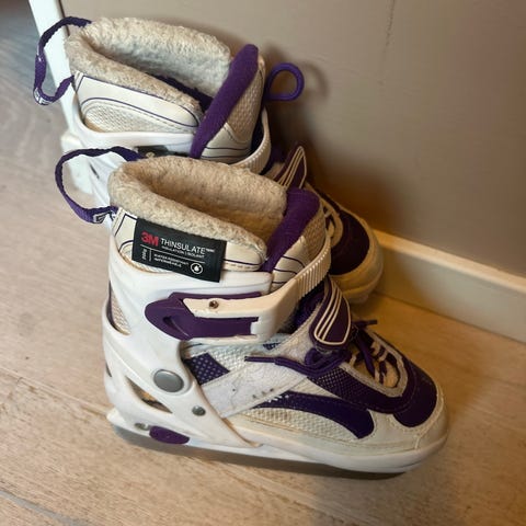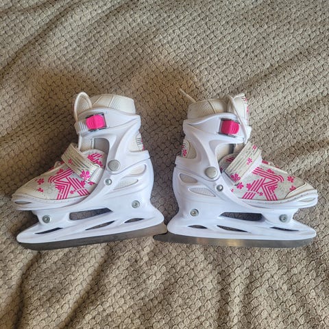Graf barn ishockeyskøyter med justerbar størrelse 30-33 Skøytene er i svart og hvitt materiale og er beregnet for ishockey.