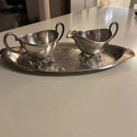 Sølvplett kremkanne og sukkerbolle med tilhørende fat. Settet består av en kremkanne med håndtak, en sukkerbolle og et rektangulært fat med dekorative detaljer. Passer til servering av fløte og sukker ved bordet. Lengden på brettet er 21 cm