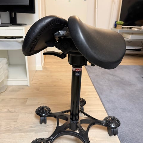 Stolen egner seg godt i ulike høyder og til ulike flater med sin utradisjonelle design. Stolen blir kalt The Saddle Chair og ble designet med utgangspunkt i en rytters dynamiske sittestilling. Med sadelsetet kan du variere mellom lav og høy arbeidsstilling - helt opp til stående, slik at du blir mer dynamisk, men balansert.