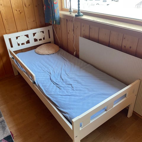 IKEA enkeltseng for barn i hvit farge. Pent brukt. Madrass kjøpt ny i mars. Selges samlet.