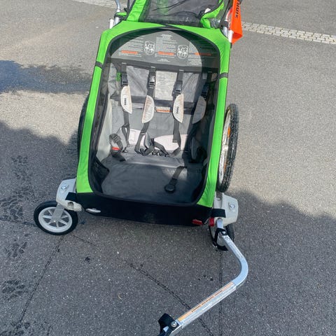 Thule sykkelvogn for barn med dobbel sitteplass. Vognens ramme er laget for å gi god beskyttelse og komfort under sykling. Den har store hjul for stabilitet og enkel manøvrering, samt et beskyttende nett foran. Vognens farge er blå og den har et håndtak for skyving. Det er også oppbevaringsplass bak i vognen.