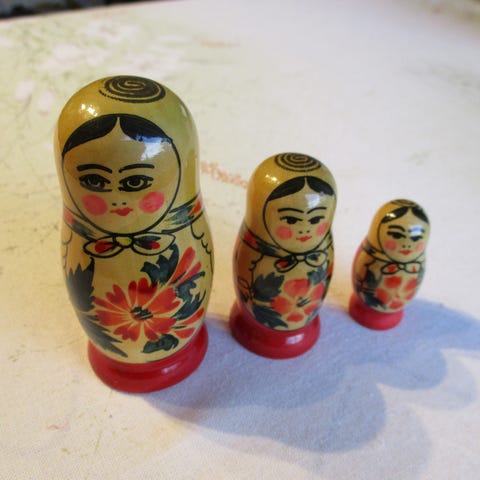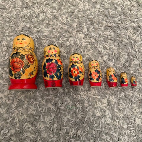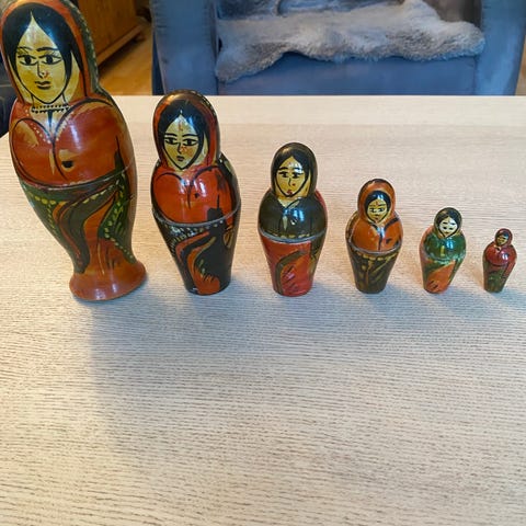Russiske Babushka dukker i sett med 6 stk laget av tre. Dukker er malt med tradisjonelle mønstre i rødt, gult og grønt. Hver dukke kan åpnes og inneholder en mindre dukke inni. Passer til dekorasjon eller samling.